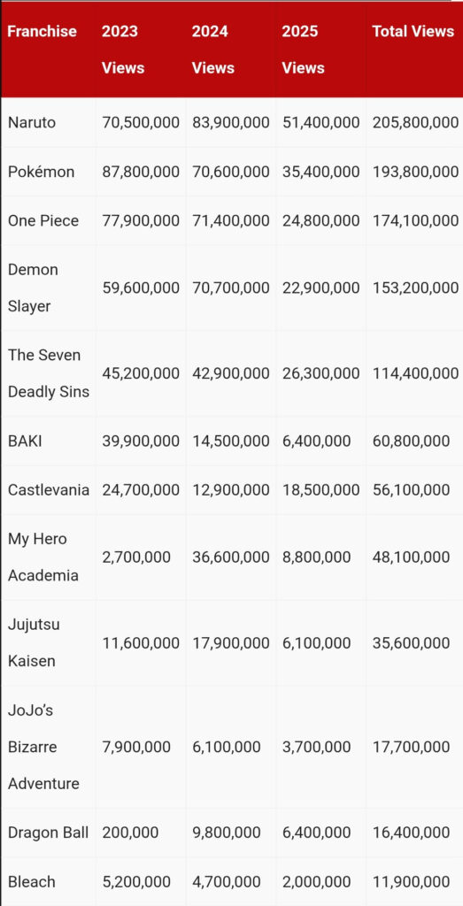Namun, Naruto masih bertahan sebagai franchise terbesar dengan total view yang luar biasa. Data Netflix menunjukkan sejak Januari 2023 hingga pertengahan 2025, Demon Slayer mendominasi daftar tontonan. Lima arc serial ini bahkan berhasil menembus Top 10 anime dengan jumlah penonton terbanyak.
